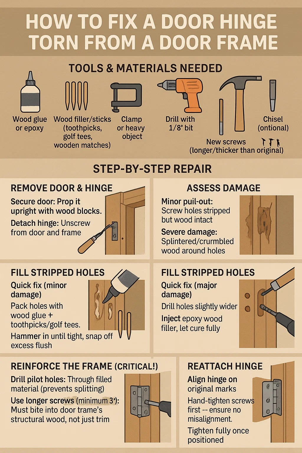 Slik fikser du en Dørhengsel revet fra en dørkarme, trinn for steg: