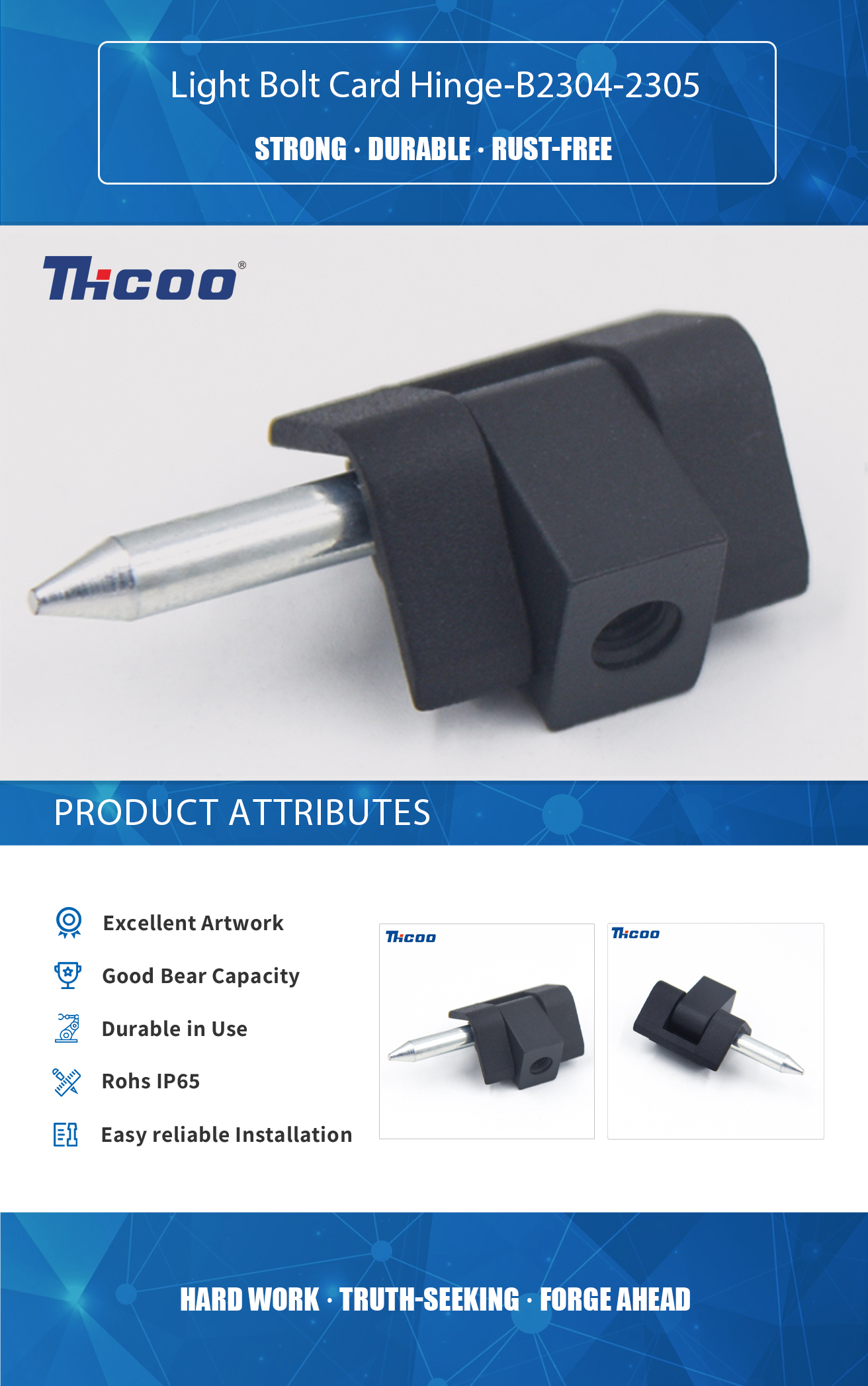 Vi har vårt eget testlaboratorium og det avanserte og komplette inspeksjonsutstyret, som kan sikre kvaliteten på produktene. Light Bolt Card Hinge-B2304-2305  er vanligvis små og ikke-påtrengende, noe som gjør dem til et godt valg for applikasjoner der et lavprofilhengsel er ønsket. Det brukes noen ganger i emballasje for å holde små kort eller paneler på plass, og gir informasjon om produktet eller bruksanvisning.