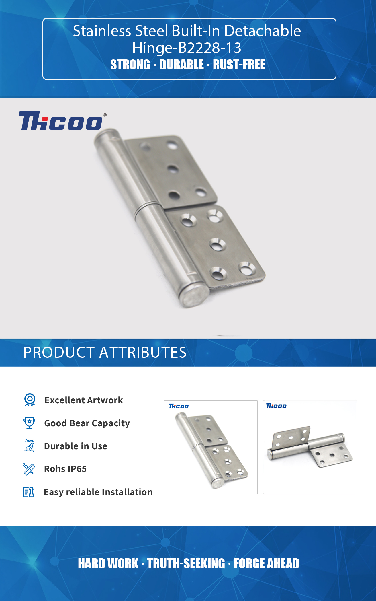 Vi har vårt eget testlaboratorium og det avanserte og komplette inspeksjonsutstyret, som kan sikre kvaliteten på produktene. Rustfritt stål innebygd avtakbart hengsel-B2228-13 er en type hengsel som er laget av rustfritt stål og er designet for å bygges inn i en gjenstand, for eksempel en dør eller et skap, med hengselbladene skjult eller skjult når objektet er stengt.